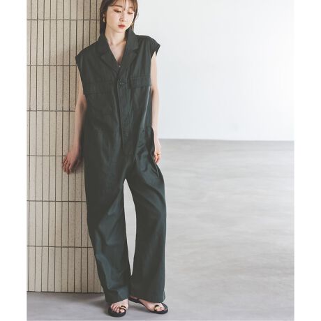 テーラーカラーとフラップポケットにIラインのシルエットが組み合わさった大人に向けたオールインワン。