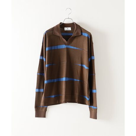 A game polo made of original deformed border fabric. It is a fabric made by multiplying cotton rayon yarn twisted yarn and shiny polyester yarn. It is a jacquard fabric that distorts the fabric by making a part that picks the fabric when making a knitted pattern in a border pattern. The color scheme of the inline border of 25SSTanC is adopted.
