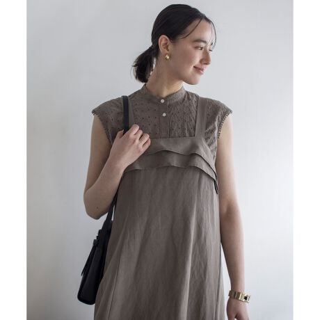 ■デザイン・身頃は花柄の小さめのアイレットレース。・前後にふった切り替のマチ部分もデザインポイント。・涼しくご着用いただけるよう少しゆとりのあるシルエットに。・ジレのようにノースリーブのカットソーとコーディネートしてジレ風の着こなしもおすすめ。