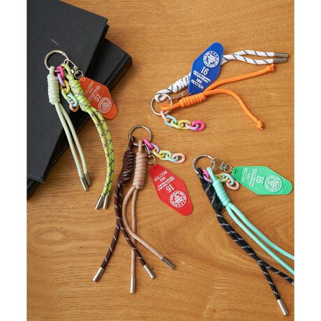 アウトドアムード漂うコード紐に、目を引くラバープレートとカラフルなチェーンが揺れるチャームです。