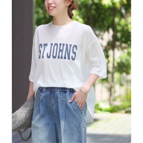 着心地:カジュアルな印象のロゴTですが、ボディがシアー素材なので女性らしく着こなせるのが◎