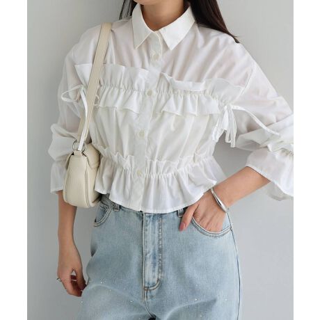 無地 ストライプ ショート丈 フリル シャツ ブラウス Freesia フリージア