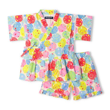 夏の風物詩の甚平が今年も入荷しました!カラフルなヨーヨー柄の甚平。涼しく着られる甚平はお祭りや夕涼み会、盆踊りなどの時はもちろん、普段使いのお部屋着としてもオススメ。【アイテム】半袖 トップス カジュアル お洒落 オシャレ かっこいい かわいい 可愛い 普段着 デイリーウェア お出かけ着 お外遊び着 子ども こども 女児 女の子 ガールズ キッズ ベビーサイズ トドラーサイズ 幼稚園 保育園 小学校 通園 通学 小学生 2025年夏物新作 丸高衣料 ボトム ハーフパンツ 半ズボン 短パン コットン100% 綿100% じんべい じんべえ オフホワイト 白色 ムージョンジョン