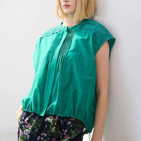 細やかなピンタックデザインと肩の繊細なレース使いででサマ見えするブラウス。