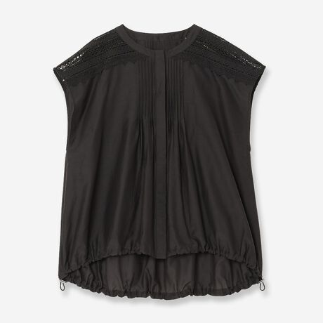 細やかなピンタックデザインと肩の繊細なレース使いででサマ見えするブラウス。