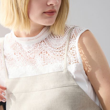レースデザインですが、甘くなり過ぎずカジュアルな雰囲気に仕上げているので、リネンやデニム素材のボトム等と好相性。