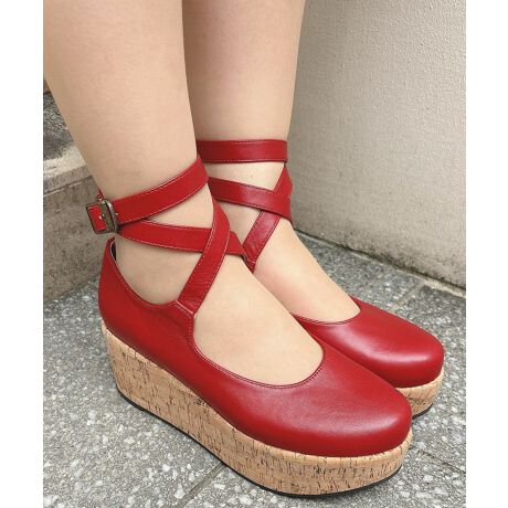 コルク調のソールとクロスストラップがクラシカルなムードたっぷりのパンプス。