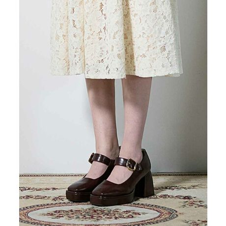 スクエアトゥに金具使いのワンストラップが効いた上品なパンプス。