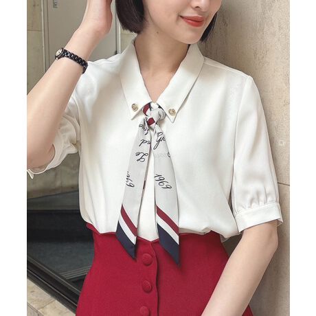 ロゴと配色ラインが効いたスカーフがフレンチなムードたっぷりのブラウス。