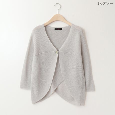 メッシュニットの編み地を切り替え表情豊かに仕上げたVネックカーディガン。ラウンドヘムをレイヤードした立体的なバックシルエットが特徴的なお作りです。フロントの大きめシェル風ボタンもさりげないアクセント♪七分丈のワイドスリーブに風通しの良い吸収速乾素材で暑い季節も快適に着ていただけます。
