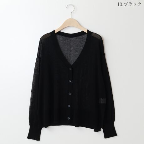 レーヨンベースで仕立てた涼し気なシアー感が魅力のニットカーディガン。フロントVカットのベーシックなフォルムでリブ幅を広めに切り替えた旬なお作りです。ゆったりとしたドロップショルダーにこなれ感あるサイドスリットで程よい抜け感をプラス。ボトム合わせにも悩むことなく、スタイリングの仕上げにさらっとプラスして頂ける汎用性抜群のアイテムです。