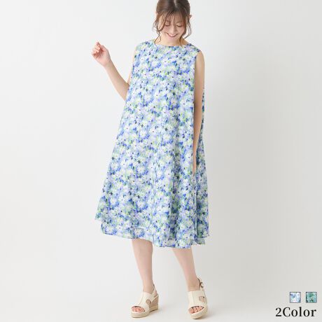 爽やかなフラワーペイントがフェミニンな雰囲気のノースリーブワンピース。サイドに施した切り替えが身幅にゆとりを持たせ、リラクシーな着心地を叶えます。動くたびに立体感がでる同柄の重なる裾がお洒落なアクセント。風通しの良いリネン混素材で気温が高い日でも快適に過ごせるおすすめのアイテムです。