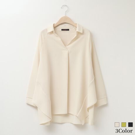 ゆる落ち感あるフォルムでリラクシーな雰囲気のブラウス。後ろにはアンブレラヨーク風のパーツを重ねサイドに沿ってフリルアクセントにした動きのあるデザインが特徴です。胸元はラフなスキッパーカラーでキリッとさせつつ、フロントタックでより立体感のあるフォルムに。ワンカラー仕立てでも存在感のあるシルエットで印象的なスタイリングを演出してくれる使い勝手の良いアイテムです。ご家庭の洗濯機でお洗濯が可能です。