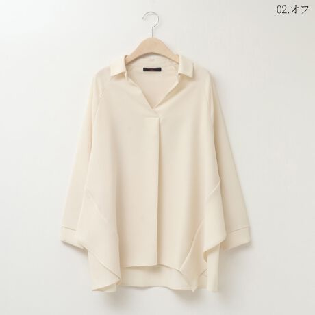 ゆる落ち感あるフォルムでリラクシーな雰囲気のブラウス。後ろにはアンブレラヨーク風のパーツを重ねサイドに沿ってフリルアクセントにした動きのあるデザインが特徴です。胸元はラフなスキッパーカラーでキリッとさせつつ、フロントタックでより立体感のあるフォルムに。ワンカラー仕立てでも存在感のあるシルエットで印象的なスタイリングを演出してくれる使い勝手の良いアイテムです。ご家庭の洗濯機でお洗濯が可能です。