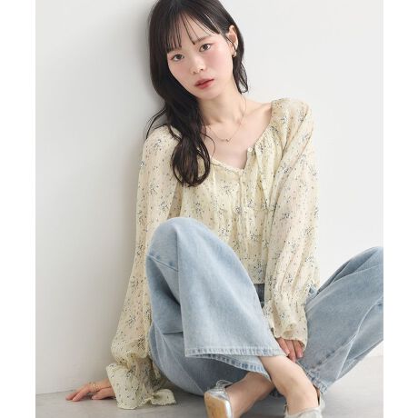 クシュクシュとしたシアー素材が華やかなデザインブラウス。コンパクトなボディーにボリュームスリーブでトレンドのこなれシルエットを演出しました。フロントの華奢なリボンがフェミニンなアクセントをプラス。デニムやロングボトムと相性よく、プラスするだけでスタイルアップも期待できる今季おすすめのアイテムです。
