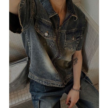 ヴィンテージウォッシュダブルジップショートデニムシャツ」