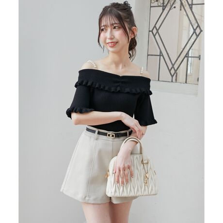 パールチェーンは取り外し可能なので、シンプルなオフショルダーとしても楽しめる2way仕様なのも嬉しいポイントです。