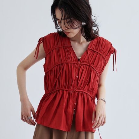 ギャザーが施されたトレンド感あるスリーブレスブラウス。
