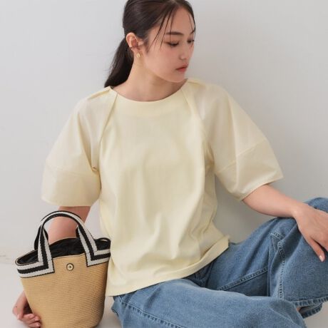 ・ボディは着心地の良いカットソー素材、袖部分にはシャツ素材をドッキングしたランタンスリーブデザイン。