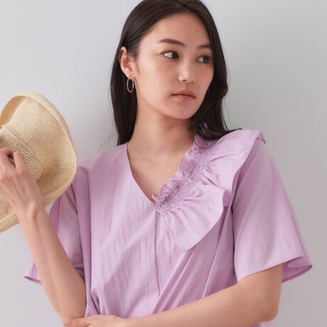 アシンメトリーに付けたフリルが華やかなVネックブラウス