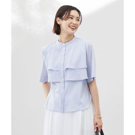 ■デザイントラッドな雰囲気を残しつつ、女性らしい華やぎを加えたティアードブラウス。バンドカラーの端正な印象と、フロントのフリルディティールの柔らかな表情が絶妙にマッチした1着。程よい丈感で、どんなボトムスにも馴染み、釦を開ければ軽やかな羽織としても活躍します。肘が隠れる袖丈は、ロールアップで表情を変えられるのも魅力。長めの丈のワイドパンツ合わせた、大人マニッシュなスタイリングもおすすめです。