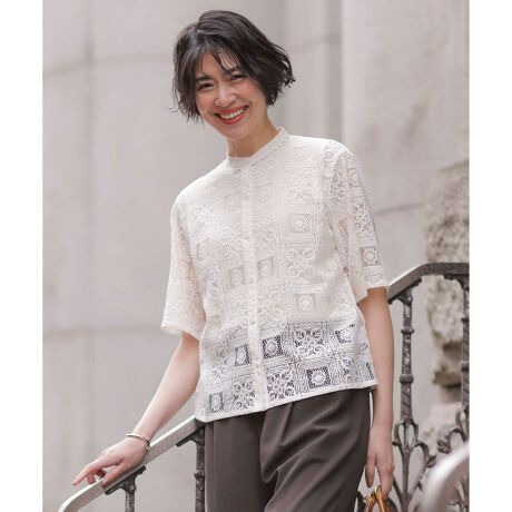■デザイン繊細なレースのモチーフが上品な印象を与えるハーフスリーブブラウス。甘さのある素材ながらも、バンドカラーとすっきりとしたスリーブデザインが絶妙なバランスで、大人の落ち着いた雰囲気に仕上げています。前を閉じて1枚着として、釦を開けて軽やかな羽織りとしても活躍します。きれい目な着こなしにはもちろん、デニムやチノパンと合わせれば、程よくカジュアルな抜け感が加わり、品の良さはキープしつつも、リラックスした着こなしが楽しめます。