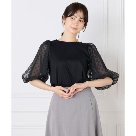 ■デザインたっぷりとした映え袖が華やかさを演出するデザインカットソーは、袖の内側にチュールを仕込んでボリュームを持たせたこだわり仕様。トレンドのシアー素材には、オパール加工でドット柄を表現した高級感のある生地を使用し、身頃は程よくすっきりとしたシルエットで、スカートにもパンツにも合わせやすいバランスに仕上げました。二の腕や肘をカバーしてくれる嬉しい袖丈もポイントです。・水洗い可■素材繊維長の長いロイヤルコットンを高密度に編み上げ、極限まで毛羽を取り除く加工を施した、上品な光沢感が魅力の素材です。綿でありながらドレープ性に優れ、淡い色でも透けにくいのが特長。ストレッチ性も高く、適度なハリ感があるため肌離れがよく、きれいめなカットソーにぴったりな仕上がりになっています。袖は柄の部分のみ生地を残すオパール加工でドットを表現したハリ感のあるシアー素材です。■サンプル撮影商品■こちらの商品はサンプルでの撮影となっております。実際の商品とは、サイズや色味、素材、デザイン等の仕様が若干変更になる場合がございます。