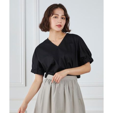 首回りをスッキリとみせるVネックにギャザーで施したふんわりとしたお袖がポイントの半袖Tシャツ。二の腕をカバーできるお袖丈で後衿はファスナーあき仕様。デイリーに着やすく華やかな印象のアイテムです。・後ろファスナー開き・水洗い可■サンプル撮影商品■こちらの商品はサンプルでの撮影となっております。実際の商品とは、サイズや色味、素材、デザイン等の仕様が若干変更になる場合がございます。
