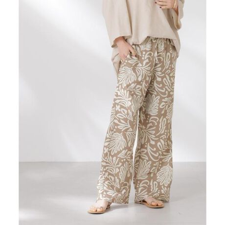 季節感のあるボタニカル柄が目をひくイージーパンツ。ウエストはノータックデザインのすっきりとしたワイドシルエットで、Tシャツなどシンプルなトップスと合わせてもグッと今年らしい着こなしに。同素材展開のブラウスとのセットアップスタイルもおすすめです。