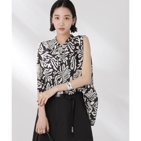 季節感のあるボタニカル柄が目をひくノースリーブブラウス。肩のタックとふんわりと空気を含むフレアシルエットが自然に体型カバー。同素材展開のブラウスとのセットアップスタイルもおすすめです。