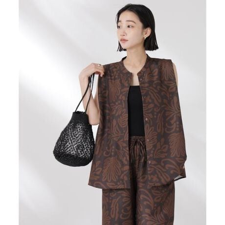 季節感のあるボタニカル柄が目をひくノースリーブブラウス。肩のタックとふんわりと空気を含むフレアシルエットが自然に体型カバー。同素材展開のブラウスとのセットアップスタイルもおすすめです。