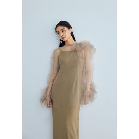 シンプルなキャミワンピースは、ブラウスとのバランスを取ってIラインシルエットを採用。