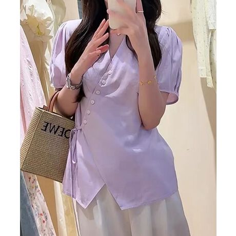 斜めに並んだボタンデザインが目を引くアシンメトリーデザインのシャツブラウス。ウエストに添えた調節ひもでシルエットを引き締め、自然にスタイルアップが叶います。爽やかなカラー展開で、春夏の着こなしにぴったりのアイテムです。