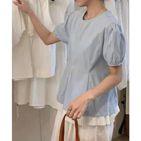 軽やかなプリーツを裾にあしらった、フェミニンな雰囲気漂う半袖プルオーバー。裾に施された異素材の切り替えデザインが、さりげなく着こなしにアクセントを添えてくれます。