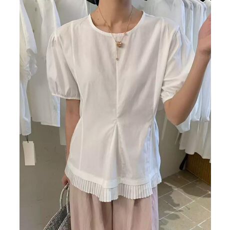 軽やかなプリーツを裾にあしらった、フェミニンな雰囲気漂う半袖プルオーバー。裾に施された異素材の切り替えデザインが、さりげなく着こなしにアクセントを添えてくれます。