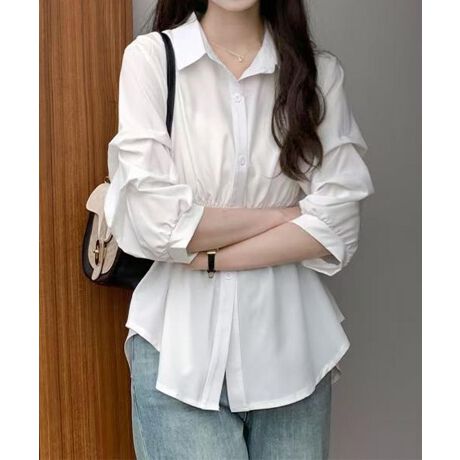 ベーシックなシャツカラーに、カジュアルなニュアンスを添えたデザイン。袖口にもゴムを入れ、軽くたくし上げた着こなしもおすすめ。パンツにもスカートにも合わせやすく、デイリーからお出かけまで幅広く活躍します。