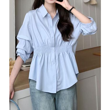 ベーシックなシャツカラーに、カジュアルなニュアンスを添えたデザイン。袖口にもゴムを入れ、軽くたくし上げた着こなしもおすすめ。パンツにもスカートにも合わせやすく、デイリーからお出かけまで幅広く活躍します。