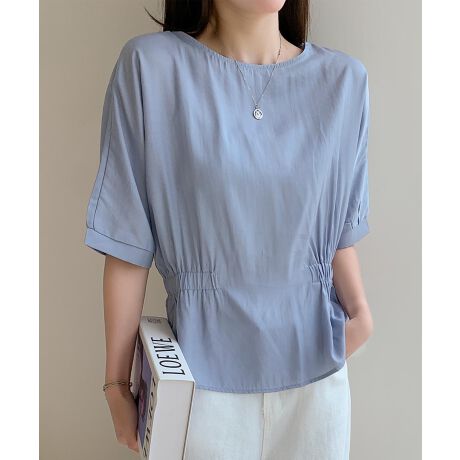 さらりとした肌触りの生地に、ウエストゴム仕様を取り入れたブラウス。自然にウエストラインを引き締め、ふんわりとしたシルエットにメリハリをプラス。締めつけ感が少なく、リラクシーな着心地が魅力です。