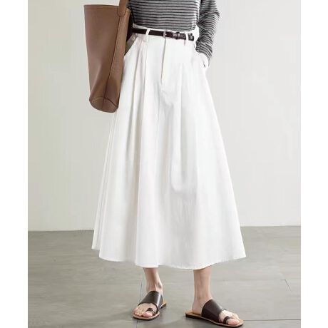 上品なハリ感素材で仕立てたAラインミディスカート。ウエストには細ベルトをあしらい、シンプルながら洗練された印象に。後ろウエストはゴム仕様になっており、着心地の良さと美しいシルエットを両立しています。
