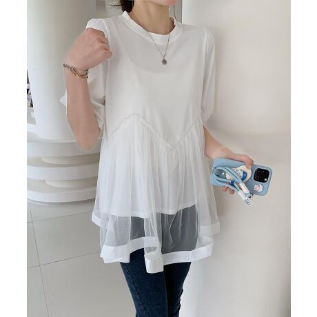 カジュアルなTシャツスタイルに、柔らかなチュール素材をドッキングしたフェミニンな一枚。異素材のコントラストがスタイリングに立体感を与え、動きに合わせてふわりと広がる裾が軽やかで印象的です。
