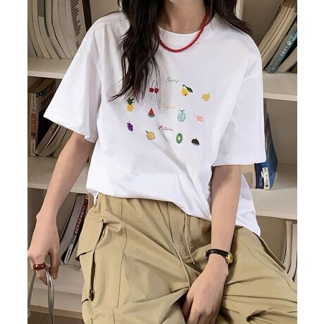 カラフルなフルーツ刺繍がデザインされた、リラックス感あふれるコットンTシャツ。シンプルなTシャツにかわいらしいフルーツモチーフが散りばめられて、目を引くアクセントに。