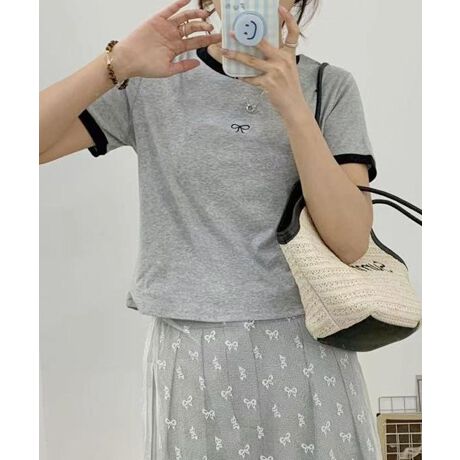 シンプルなデザインにリボン刺繍がアクセントとなったカラーブロックTシャツ。胸元のかわいいリボンデザインがワンポイントに♪
