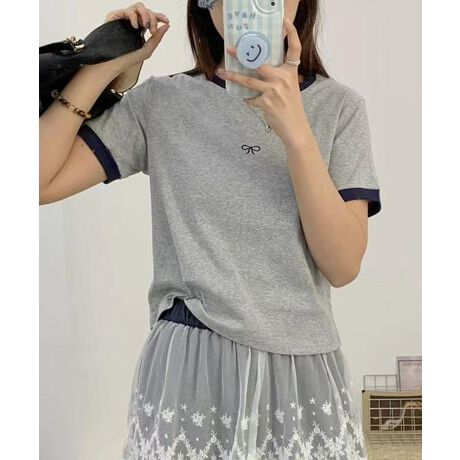 シンプルなデザインにリボン刺繍がアクセントとなったカラーブロックTシャツ。胸元のかわいいリボンデザインがワンポイントに♪