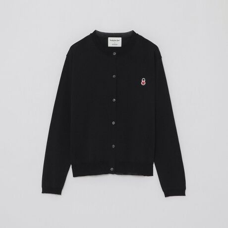 ベーシックなクルーネックカーディガンに、オリジナリティキャラクターのバッキンガムベアワッペンがワンポイント。