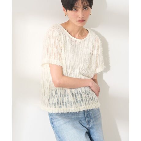 フェザーな風合いのフリンジヤーンをMIXさせたトレンドライクなチュールTシャツ。ソフトなシアーの柔らかな雰囲気がスタイリングを華やかに格上げしてくれる一枚です。ゆったりとしたシルエットでインナーを選ばず、様々なボトムと好相性。きれい目はもちろん、カジュアルスタイルにもマッチする使い勝手の良いアイテムです。透け感[あり]