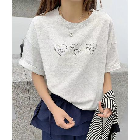 胸元に並んだ手描き風のハートモチーフが、控えめながらも愛らしいアクセントに。シンプルな中にもデザイン性が光る、カジュアルに着まわせるTシャツです。