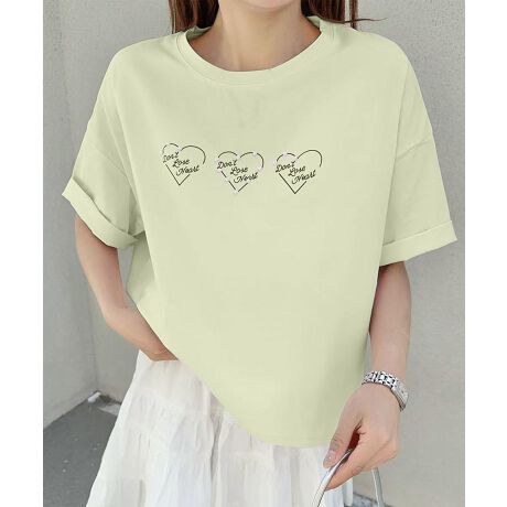 胸元に並んだ手描き風のハートモチーフが、控えめながらも愛らしいアクセントに。シンプルな中にもデザイン性が光る、カジュアルに着まわせるTシャツです。