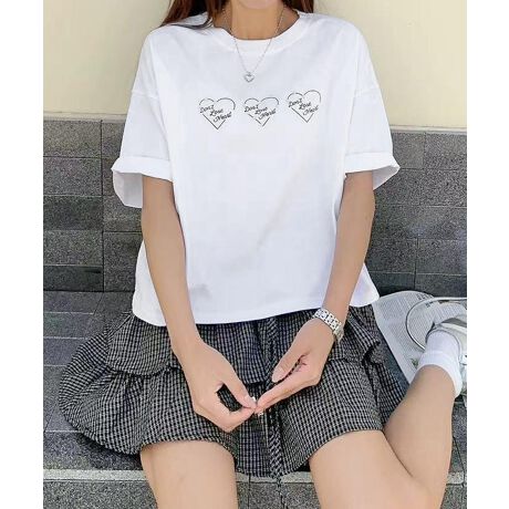 胸元に並んだ手描き風のハートモチーフが、控えめながらも愛らしいアクセントに。シンプルな中にもデザイン性が光る、カジュアルに着まわせるTシャツです。