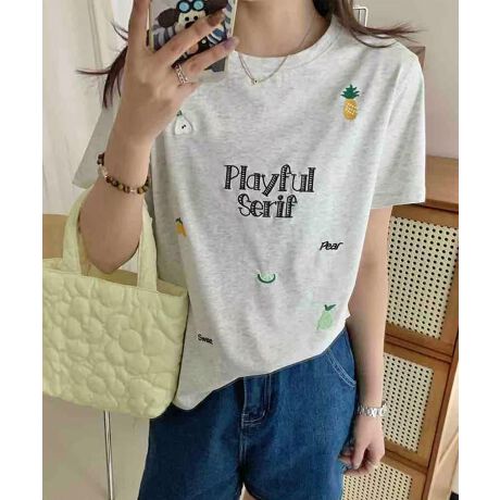 ポップなフルーツアイコンとロゴデザインが目を引くTシャツ。甘すぎないカラーに遊び心をプラスして、カジュアルスタイルに程よいアクセントになります。