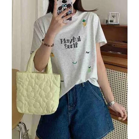 ポップなフルーツアイコンとロゴデザインが目を引くTシャツ。甘すぎないカラーに遊び心をプラスして、カジュアルスタイルに程よいアクセントになります。